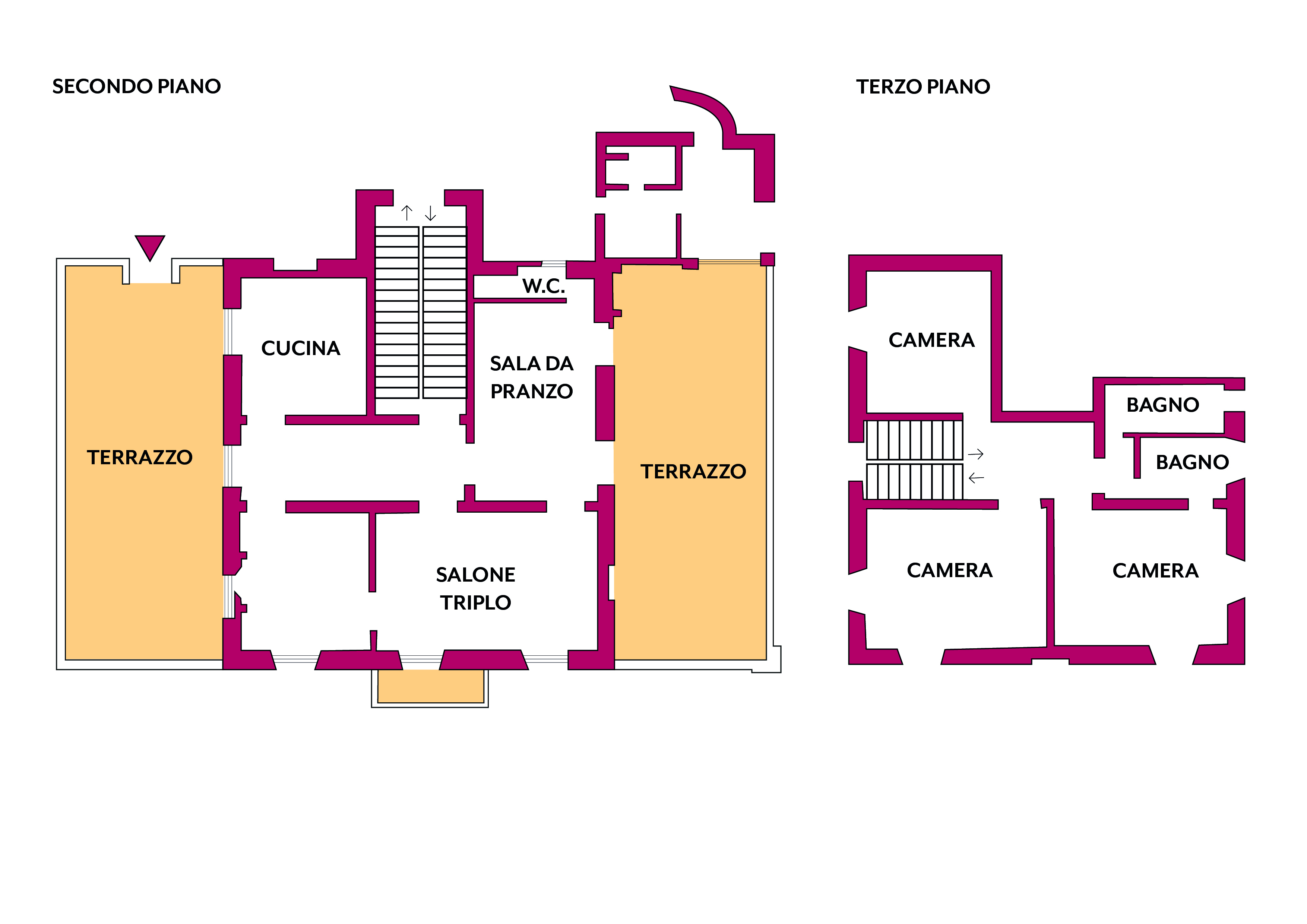 Piano secondo: ingresso indipendente, grandioso salone triplo con 2 camini e balcone, ampia sala da pranzo, cucina abitabile, bagno, 2 TERRAZZI, scala che collega alla zona notte composta da 3 camere da letto, doppi servizi.