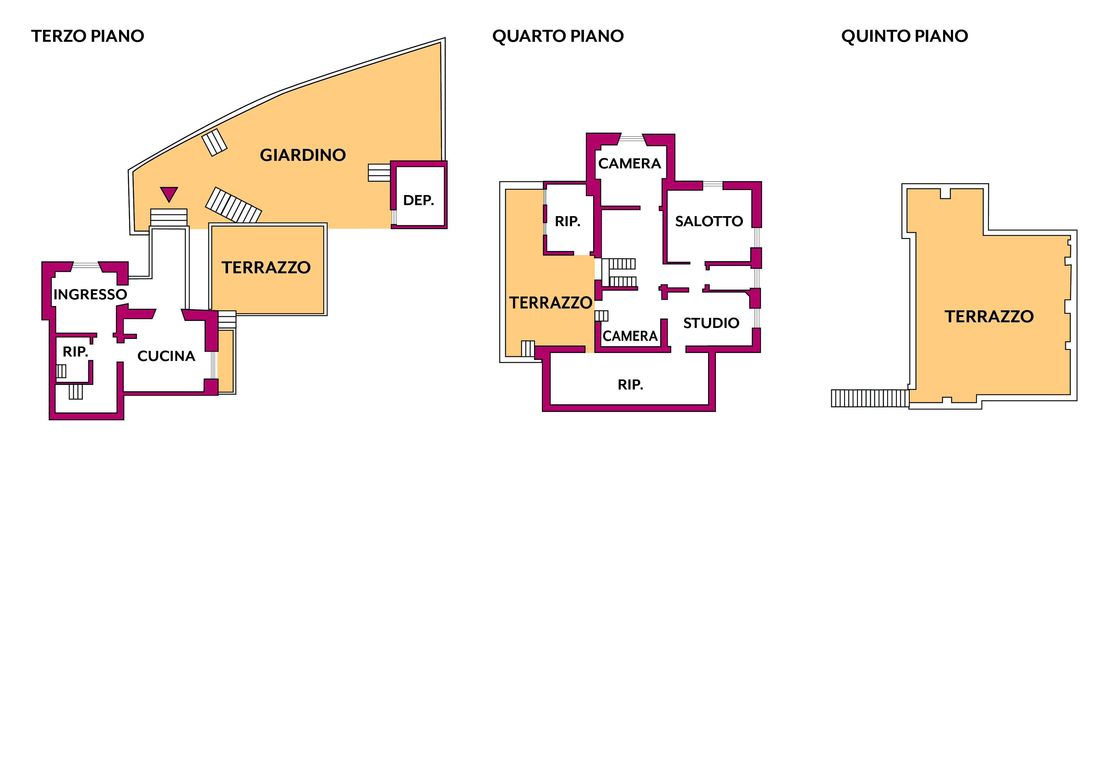 Piano terzo: ingresso indipendente tramite GRANDE GIARDINO, cucina con accesso al TERRAZZO, ripostiglio/dispensa, scala che collega al piano superiore con ampio soggiorno, 1 studio, 2 camere da letto, bagno, ampia soffitta, 2 TERRAZZI, di cui 1 sul tetto con VISTA ULTRAPANORAMICA CITTA’/MARE.