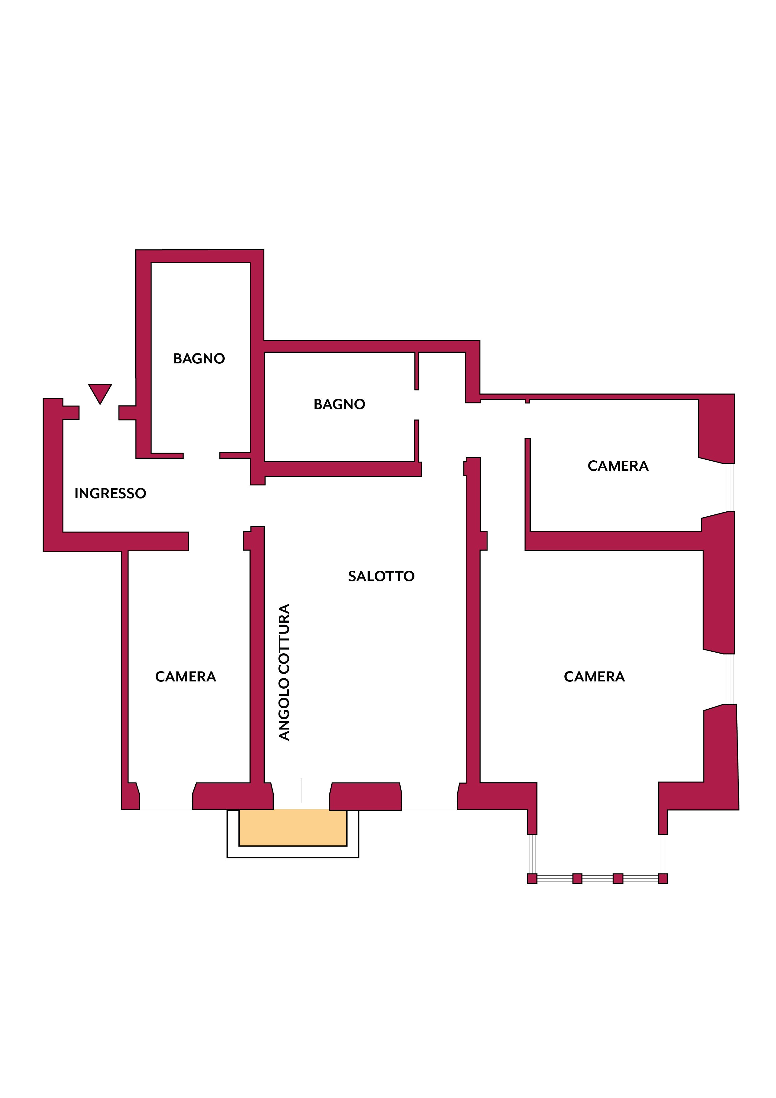 Ingresso, ampio soggiorno con angolo cottura e balcone, tre camere da letto, di cui una matrimoniale, una media e una singola, doppi servizi con doccia e lavanderia.