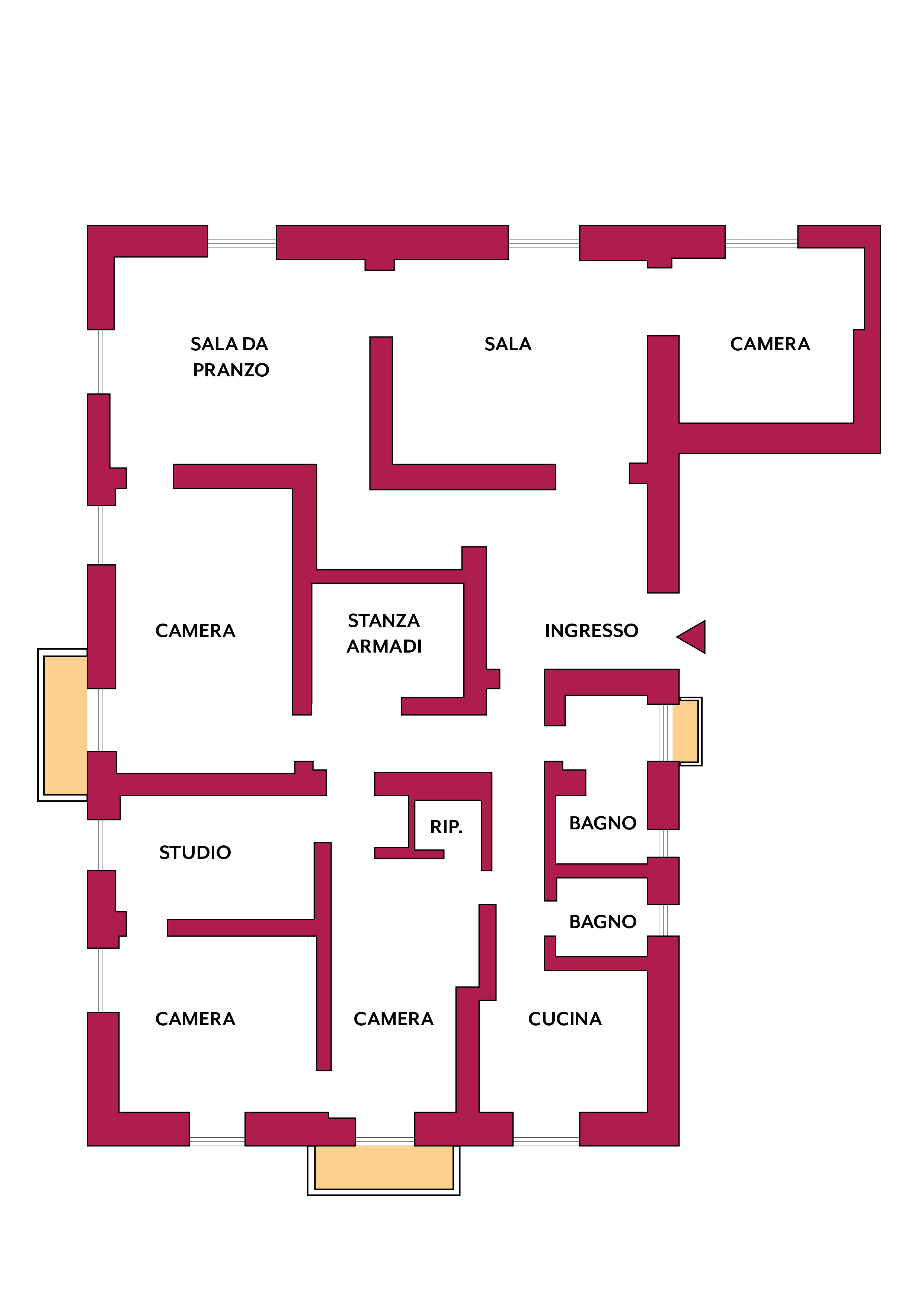 Ingresso, ampio soggiorno con annessa sala da pranzo, cucina abitabile, quattro camere da letto, uno studio, grande stanza armadi, doppi servizi con vasca, ripostiglio, tre soppalchi, tre balconi. CATEGORIA A/2
