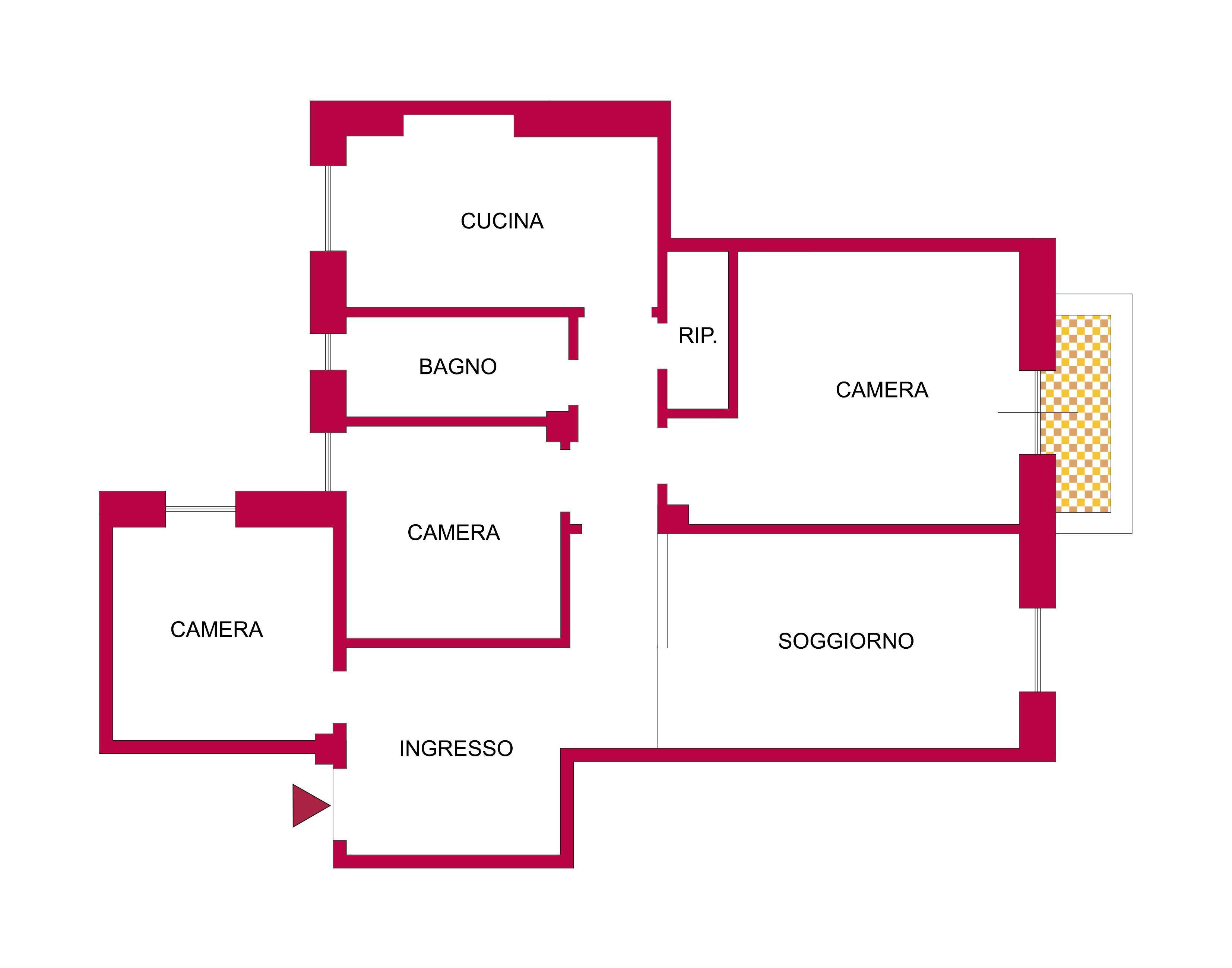 L’immobile si compone di un ingresso, soggiorno, cucina, 1 camera matrimoniale, 2 camere singole, bagno, ripostiglio ed una poggiolata vivibile.