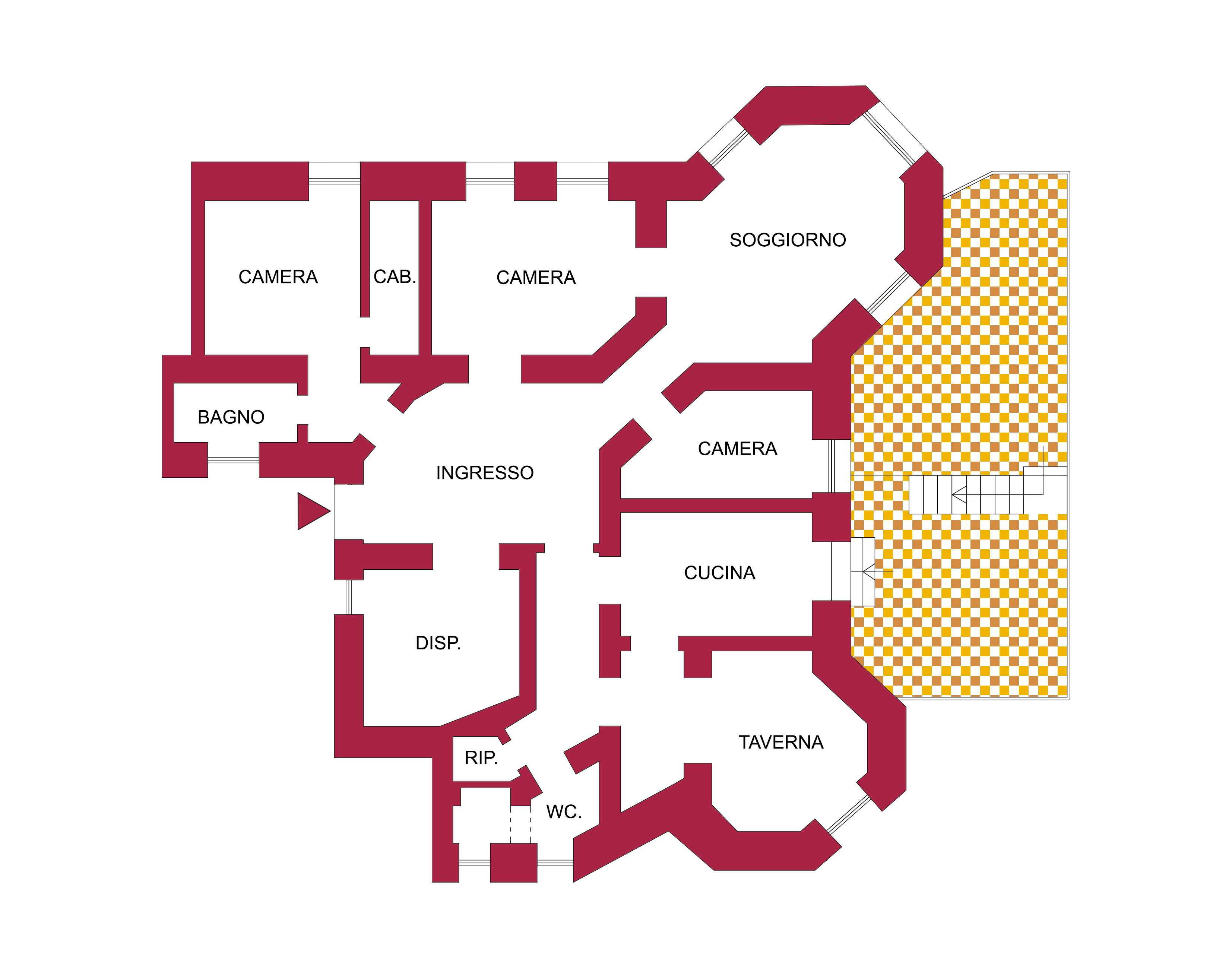 L’immobile si compone di un ingresso affacciato sul soggiorno, cucina, 2 camere matrimoniali (di cui 1 suite con bagno e cabina armadi), 1 camera singola, un bagno, 1 taverna, una dispensa, un ripostiglio ed un armadio a muro.